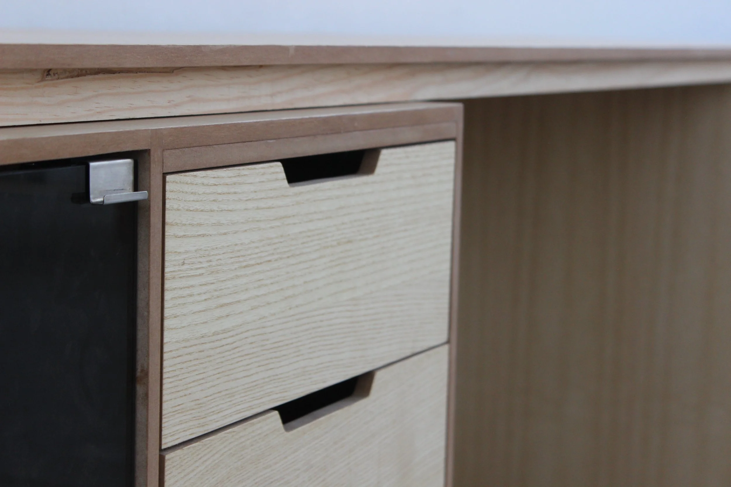 Se utilizó MDF con chapa natural de fresno y vidrio ahumado.